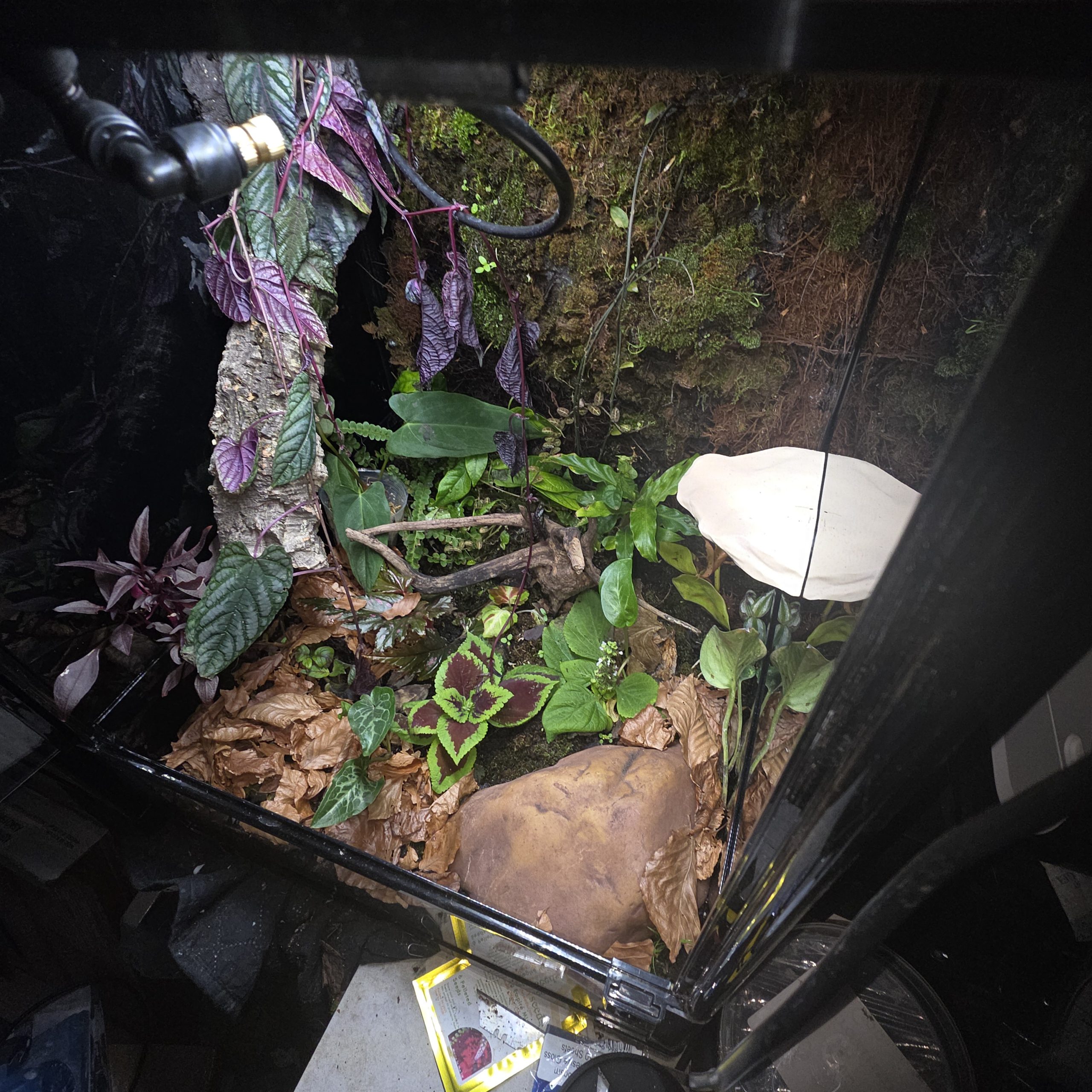 This 45 × 45 × 60cm bioactive dart frog vivarium has been carefully built and matured to create a stable miniature rainforest ecosystem. Unlike new setups, this enclosure is fully cycled, meaning the plants, microfauna, and natural processes are already working together to maintain a healthy environment.
