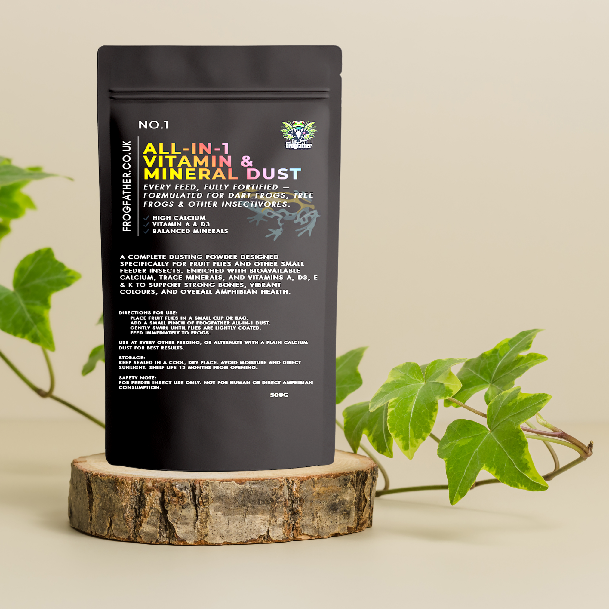 As part of our Microfauna Foods & Supplements category, this is the simple, reliable routine we use for healthy bones, bright colouration, and overall vitality in dart frogs, tree frogs and other insectivores.