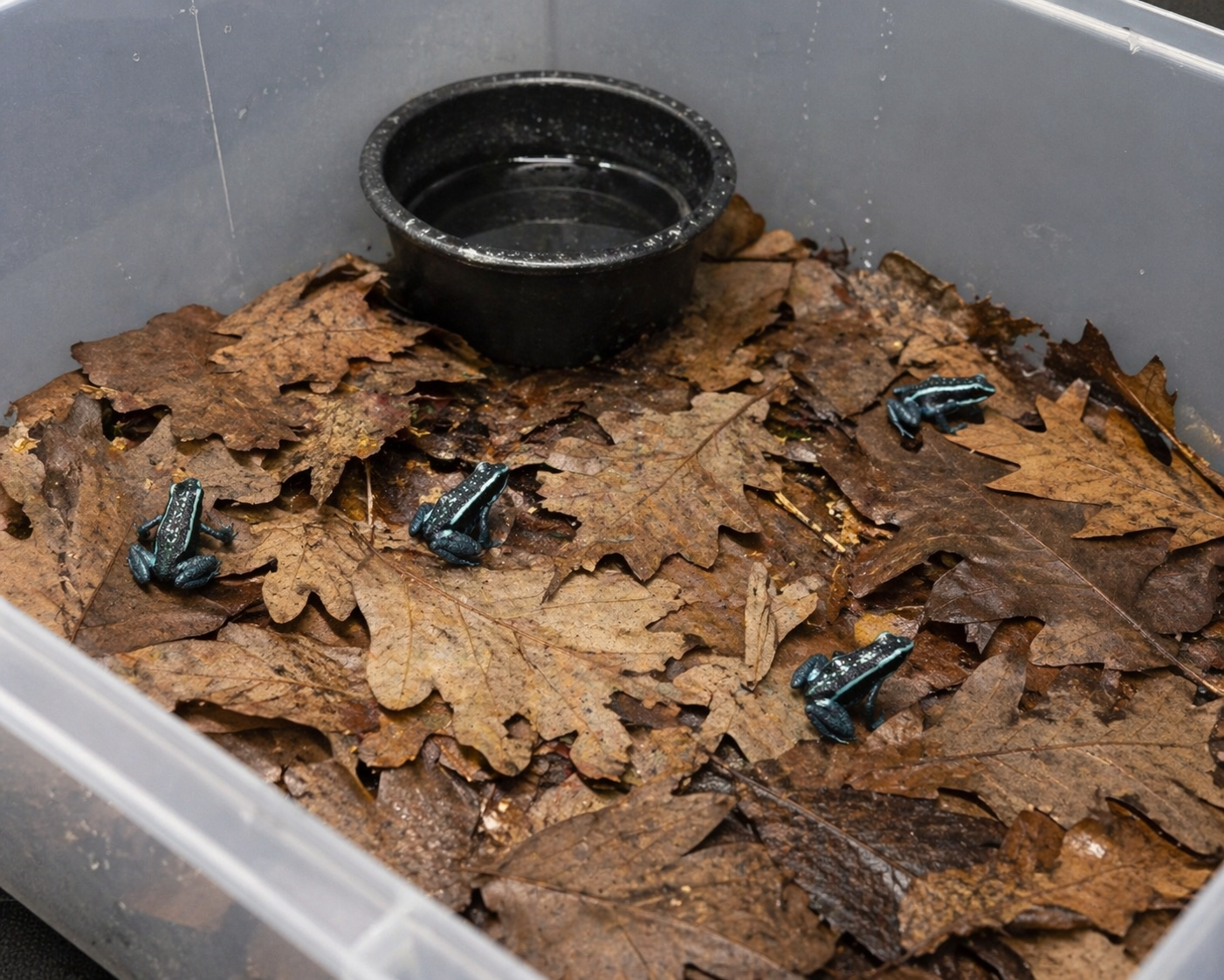 They have been supplemented all the way through development and have benefited from UVB exposure. We recommend continuing a strong supplementation routine with our All-in-1 Vitamin & Mineral Dust, which is designed to support growth, condition, colour and long-term health in dart frogs and other insectivores.