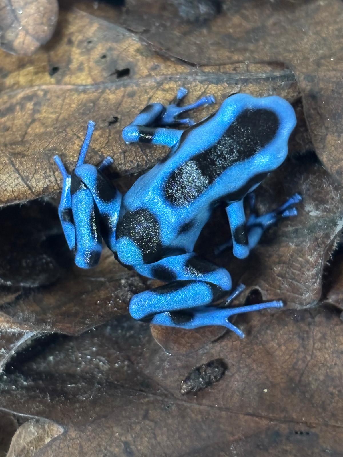 These 6-month-old Dendrobates auratus juveniles display vivid metallic blue and black markings, bringing instant rainforest flair to any planted setup. As one of the most popular dart frog species for new keepers, they’re hardy, active, and easy to manage in groups.
