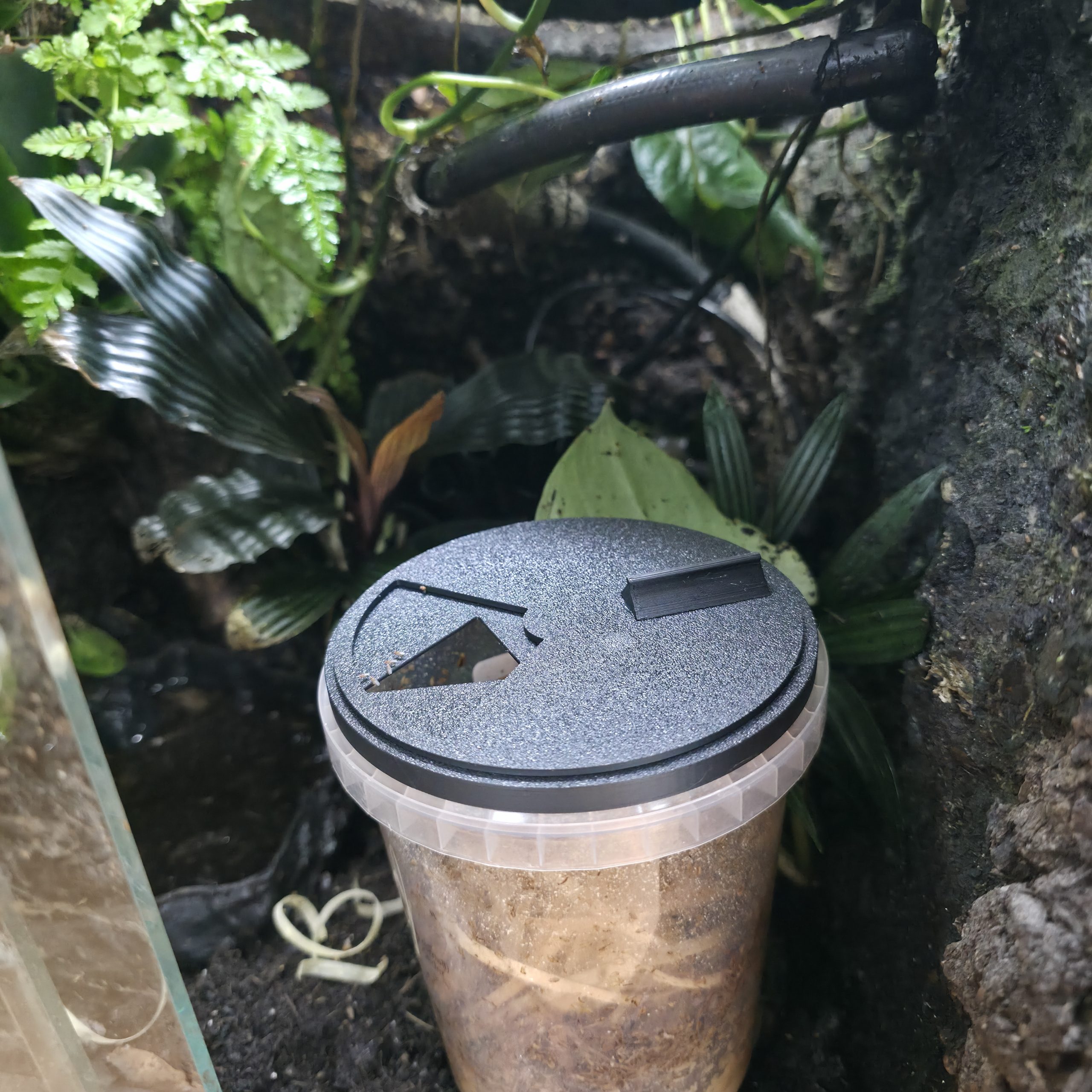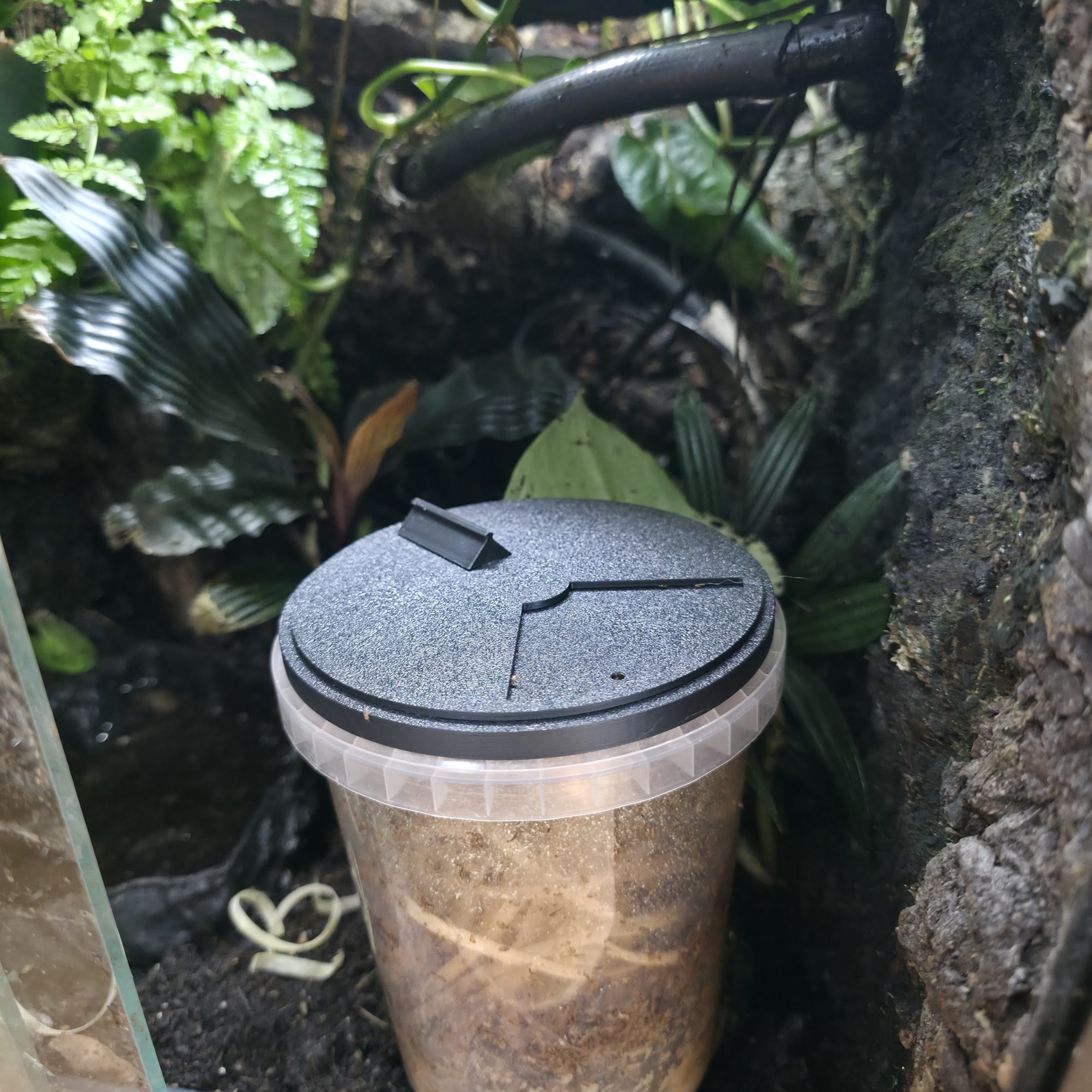 This clip-on fruit fly lid is a practical feeding upgrade for dart frog and micro-predator setups. Designed to click securely onto standard fruit fly tubs, it allows controlled fly release directly inside the vivarium while doubling as a clean, efficient tap-out lid for dusting.