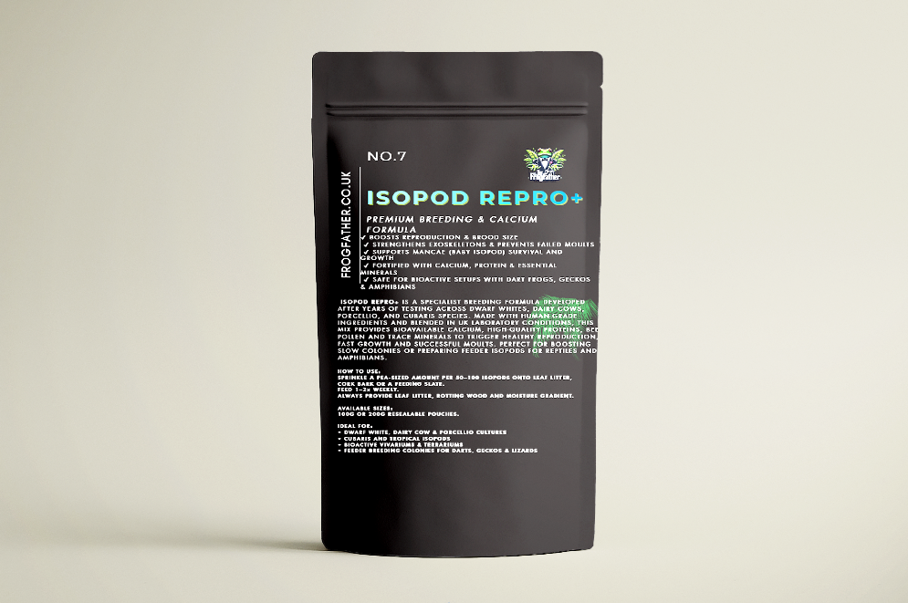 Isopod Repro+ is our advanced calcium and breeding mix, designed to boost reproduction, improve shell strength and increase baby survival rates across all isopod species — including Dwarf Whites, Dairy Cows, Porcellio, Cubaris and Armadillidium.